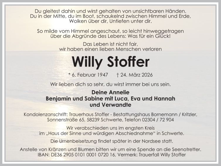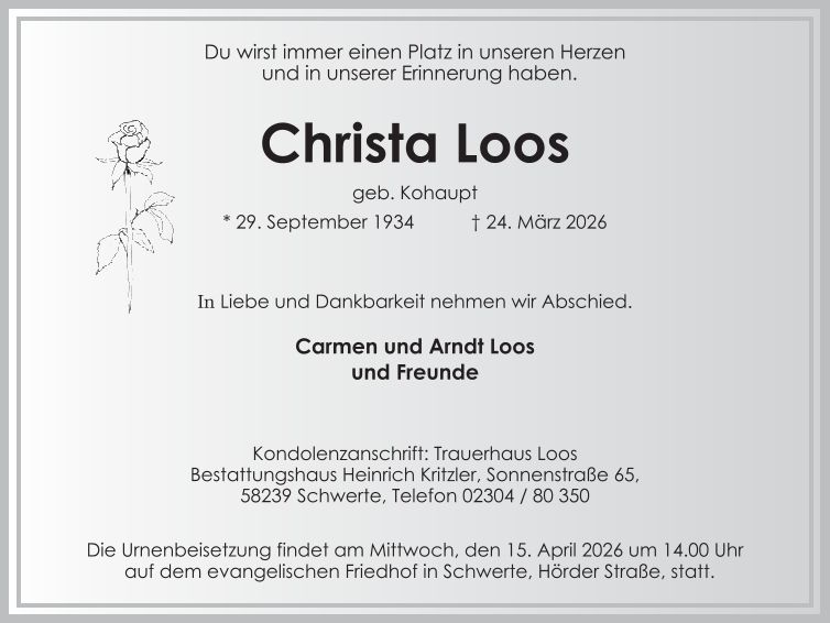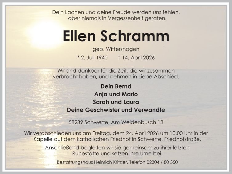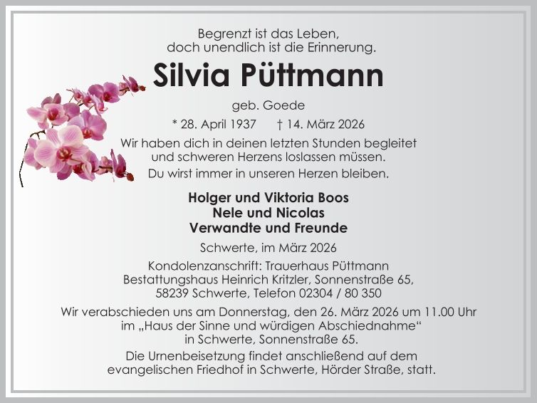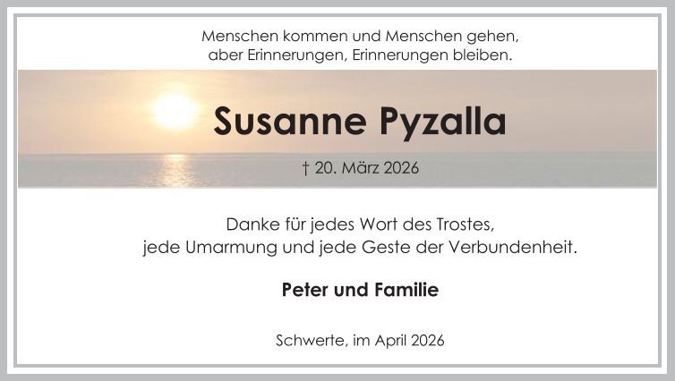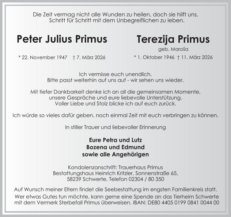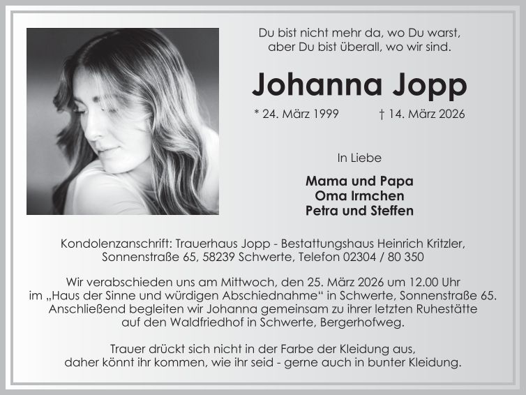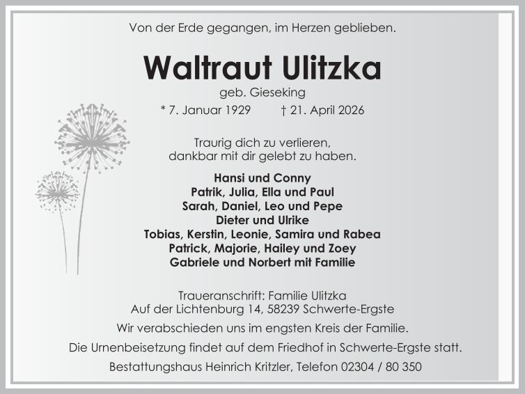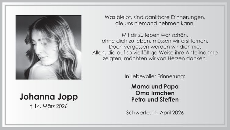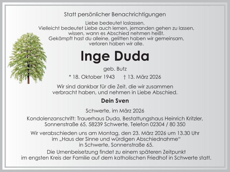 Auf dieser Seite finden Sie eine Auswahl an aktuellen Traueranzeigen, die Menschen in unserer Gemeinschaft gedenken. Wir laden Sie ein, diese Traueranzeigen zu durchstöbern und den Familien Ihr Mitgefühl auszusprechen. Diese Anzeigen dienen nicht nur als Erinnerung an die Verstorbenen, sondern auch als Quelle des Trostes für die Hinterbliebenen.