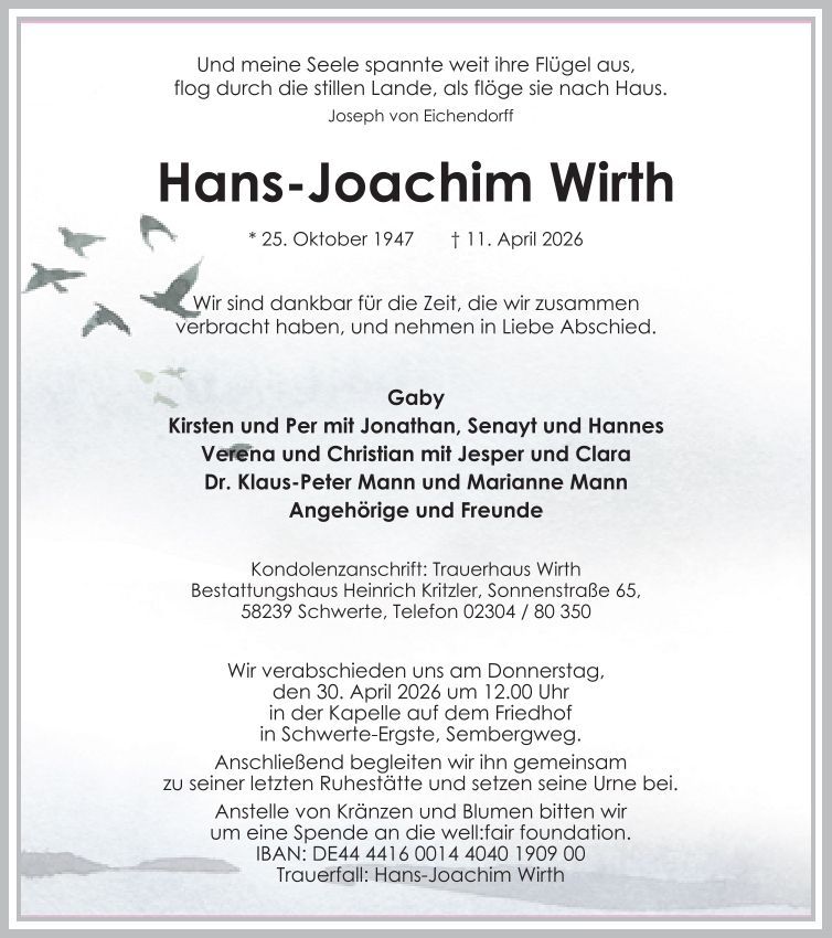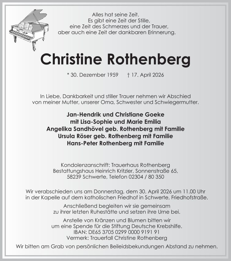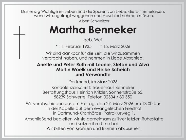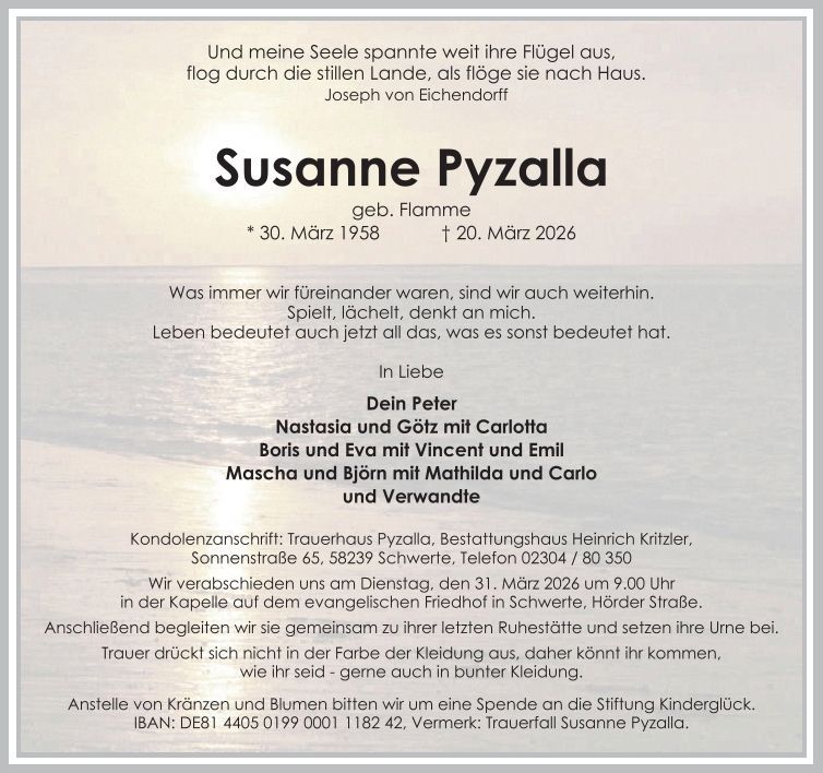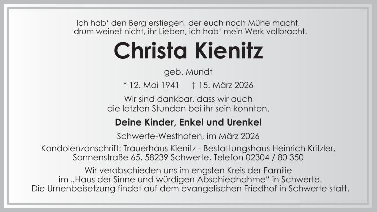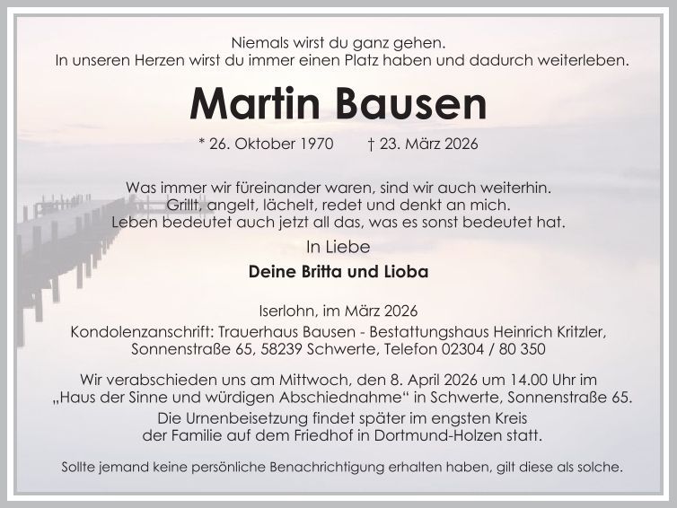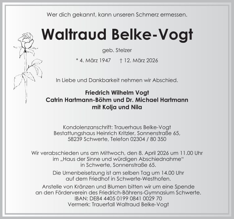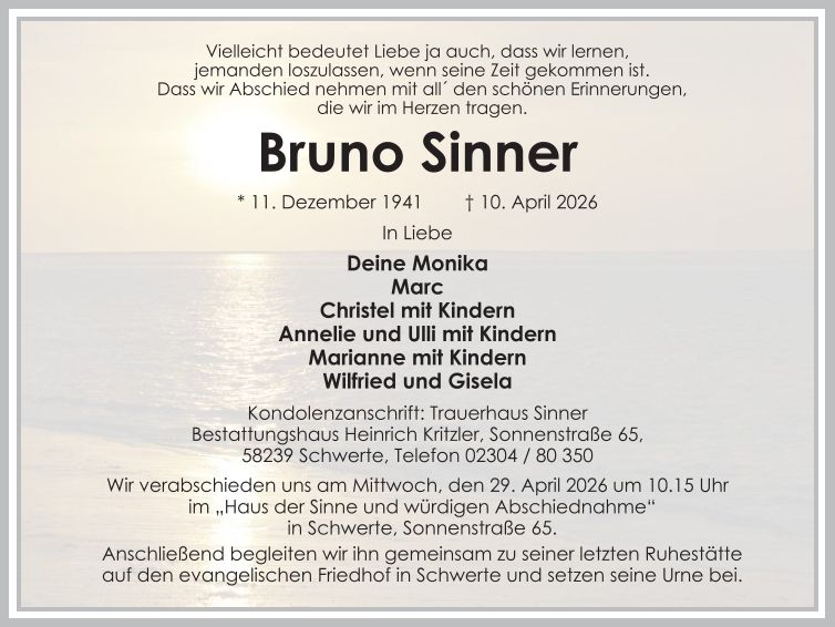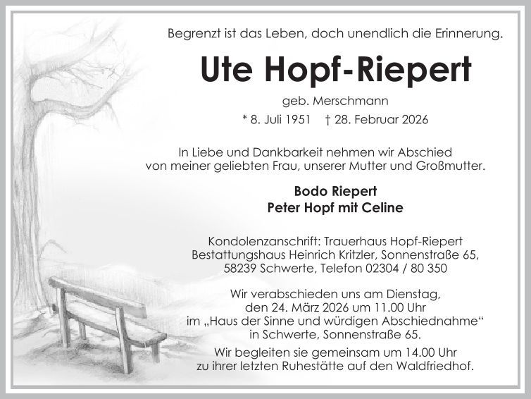 Auf dieser Seite finden Sie eine Auswahl an aktuellen Traueranzeigen, die Menschen in unserer Gemeinschaft gedenken. Wir laden Sie ein, diese Traueranzeigen zu durchstöbern und den Familien Ihr Mitgefühl auszusprechen. Diese Anzeigen dienen nicht nur als Erinnerung an die Verstorbenen, sondern auch als Quelle des Trostes für die Hinterbliebenen.